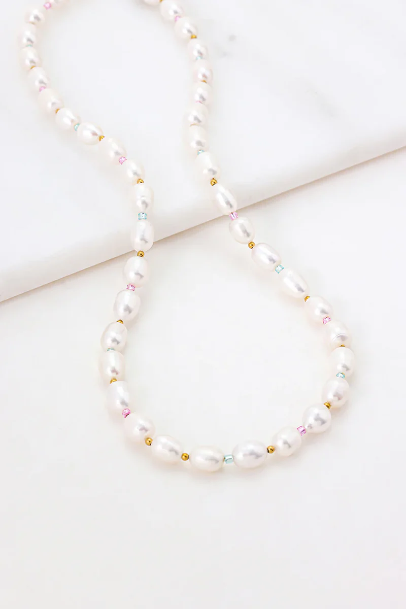The Aria Pearl Necklace is a fresh take on classic pearls, blending timeless elegance with a playful twist. Featuring lustrous freshwater pearls interspersed with pastel-toned beads and delicate gold accents, this piece brings a subtle pop of colour to your everyday look. Perfect for layering or wearing solo, Aria captures a balance of sophistication and modern charm.